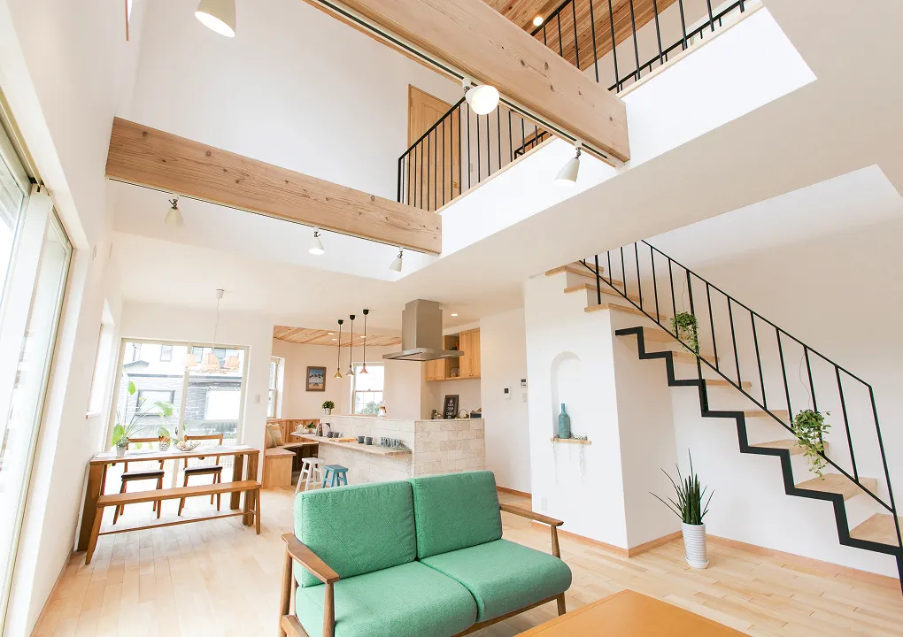 開放感のある吹き抜けリビングが、家全体を明るくします。